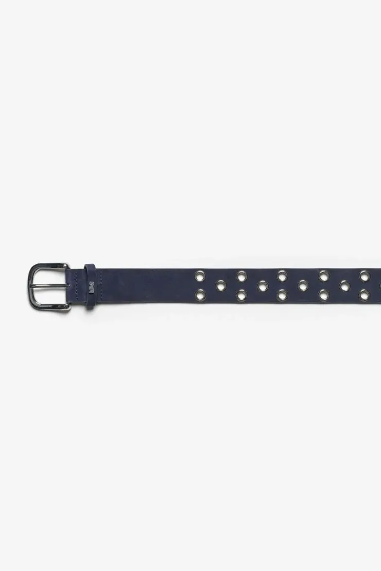 Cette Ceinture Minog En Daim Bleu Marine Est Tres Tendance Avec Ses Oeillets Metalliques Argentes, Sa Boucle Argentee Et Son Application Metallique Personnalisee « Ltc ».