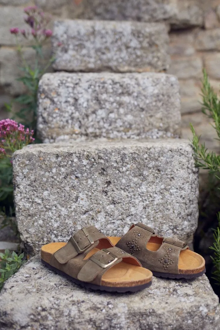 Ces Mules Naomie Kaki Sont Les Sandales Tendance De Votre Ete ! Avec Leur Matiere A L’Effet Daim, Leurs Boucles Metalliques Et Leurs Motifs Fantaisies Cloutes, Elles Completeront Vos Tenues Estivales A La Perfection.