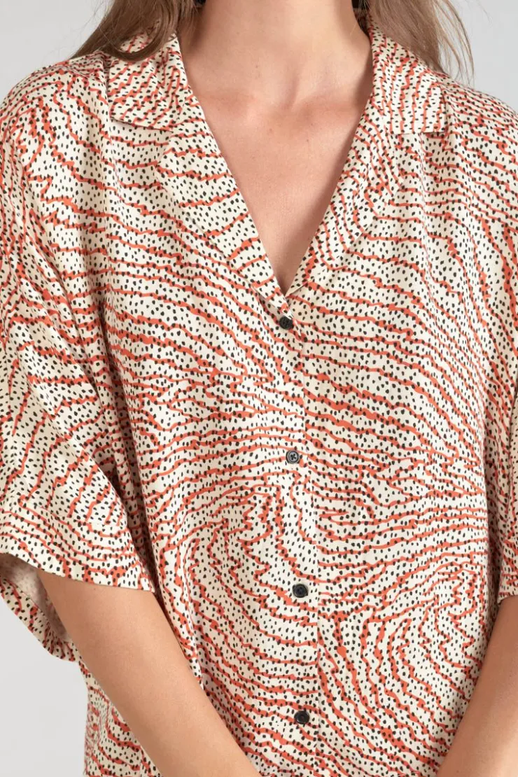 Cette Blouse Freila Est Tendance Grace A Sa Coupe Loose Plus Longue A L’Arriere Et Ses Manches Chauve-Souris, Mais Reste Pour Autant Feminine Elegante Avec Son Motif Animalier Orange Et Noir, Son Col Chemise Et Ses Boutons Noirs.