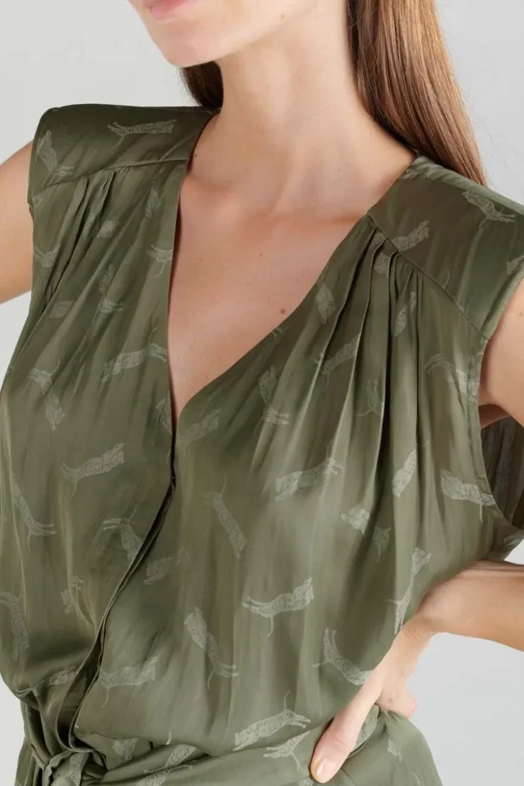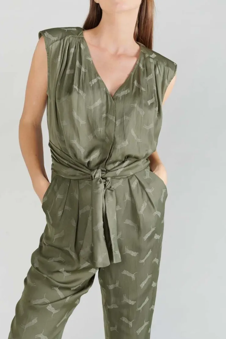 Cette Combinaison Pantalon Arte Est Tres Elegante Et Feminine Avec Son Jacquard Kaki A Motif Tigres, Ses Epaulettes Et Son Col V. Pour Plus De Style, Deux Liens A Nouer Au Niveau De La Taille A L’Avant Ou A L’Arriere Selon Vos Envies. Pour Plus De Confort, La Patte De Boutonnage Et La Fermeture Zippee Sont Invisibles.