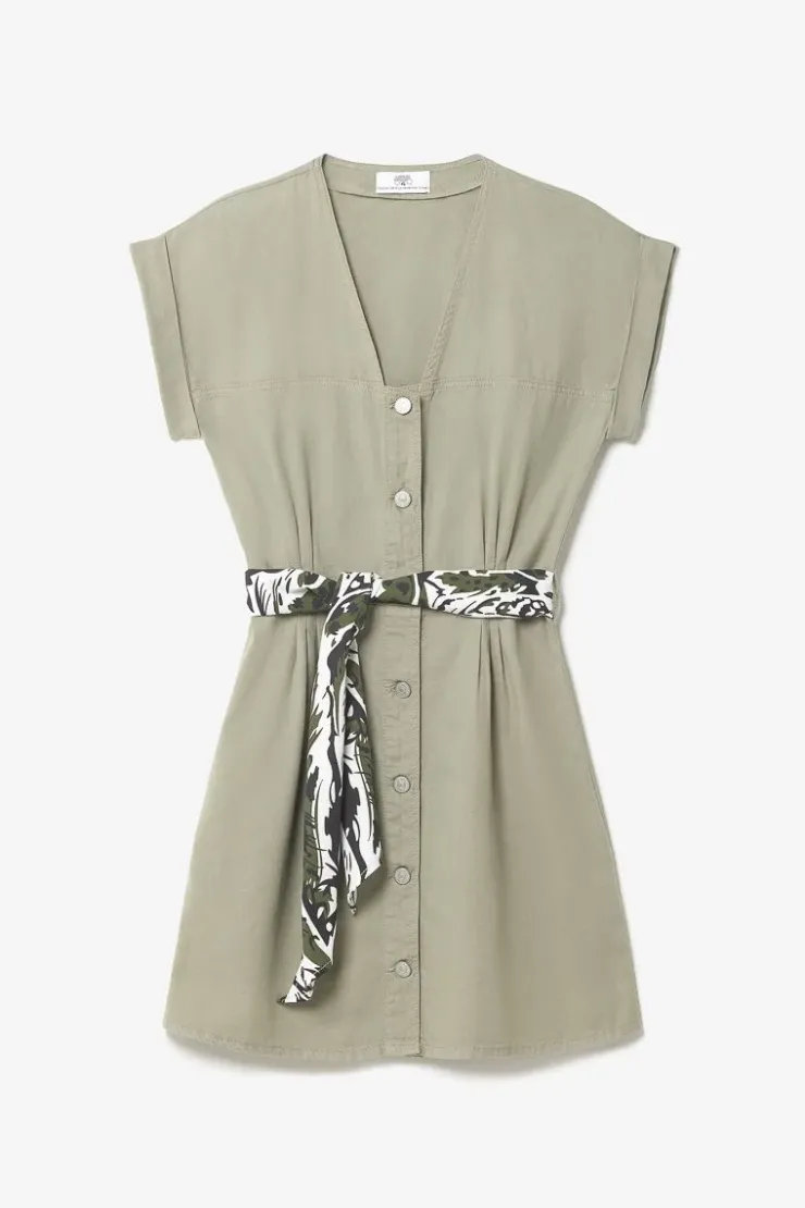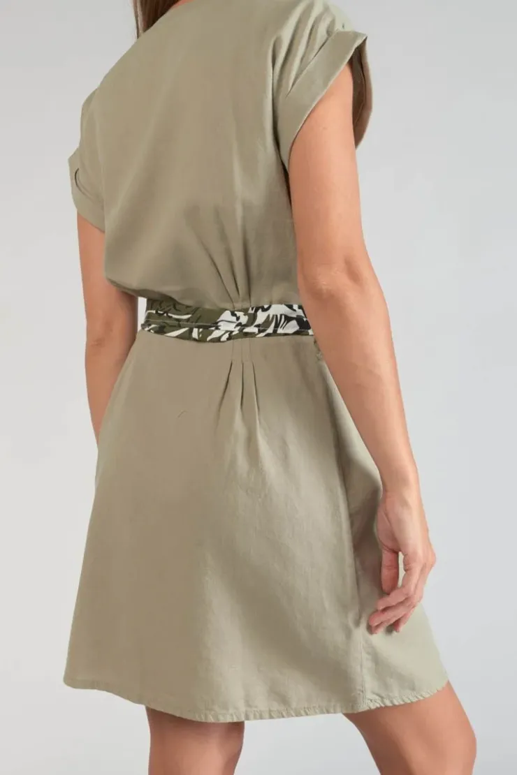 Cette Robe Eourres En Tissu Leger Kaki Clair Est Votre Allie Pour L’Ete. Sa Ceinture A Motif Kaki, Blanc Et Noir, Sa Boutonniere Argentee, Son Col Original Ainsi Que Ses Pinces A L’Avant Et A L’Arriere Pour Cintrer La Taille Apportent Le Cote Feminin A La Piece.