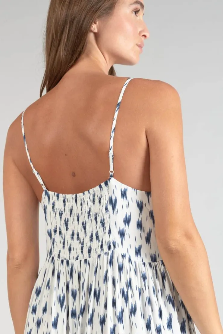 Cette Robe Evita Est Ideale Pour La Saison Estivale Avec Son Motif Effet Tie And Dye Bleu Sur Fond Blanc, Ses Fines Bretelles Et Ses Boutons En Guise De Fermeture Sur Toute La Longueur. Pour Plus De Confort, Les Bretelles Sont Reglables, La Robe Est Doublee Et La Partie Smockee Au Dos Permet De Resserrer La Poitrine.