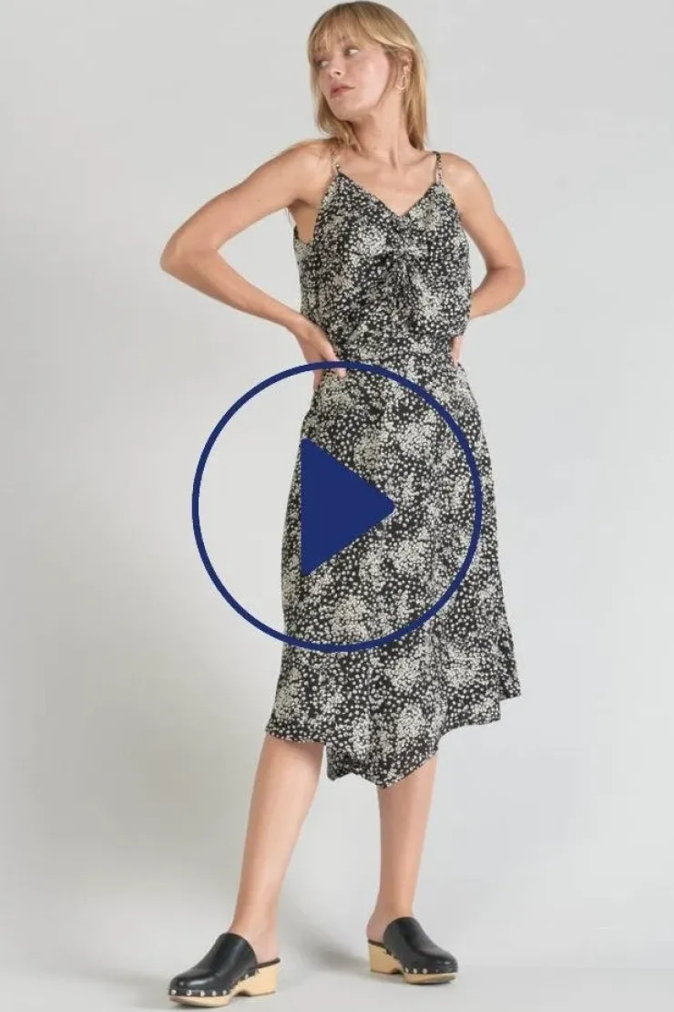 Cette Jupe Longue Cassand Est Tres Feminine Avec Son Twill Satine Fluide A Motif Fleuri Noir Et Blanc Et Au Toucher Doux Ainsi Que Sa Decoupe Originale Sur L’Avant Et Au Dos. Pour Plus De Confort, Sa Taille Est Elastiquee Et Personnalisee Le Temps Des Cerises En Fils Brillants Noirs Au Dos.