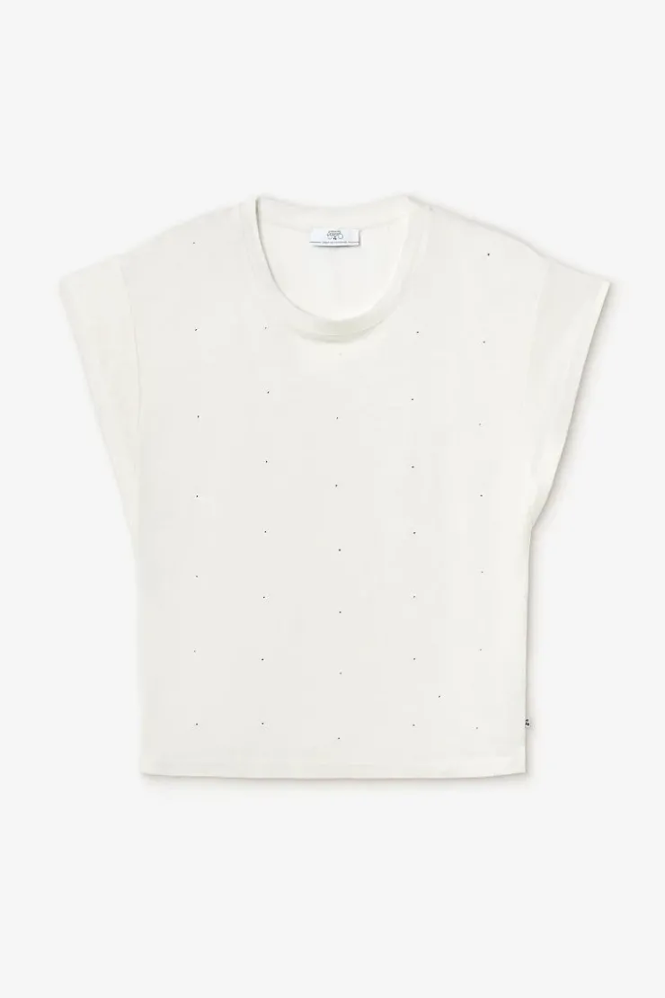 Ce Top Overs Creme En Lin Sur Le Devant Vous Donnera Un Style Casual Avec Sa Double Matiere Fluide Et Sa Coupe, Mais Aussi Feminin Avec Ses Petits Brillants Argentes A L’Avant Pour Plus De Style.