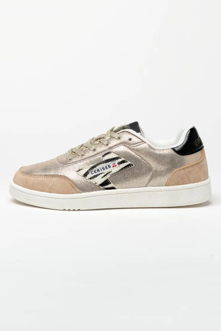Ces Baskets Flash Sont La Piece Mode De Votre Tenue Avec Leurs Couleur Doree, Empiecement Zebre En Forme D’Eclair Personnalise « Cerises » Et Lacet Avec Fils Brillants Dores.