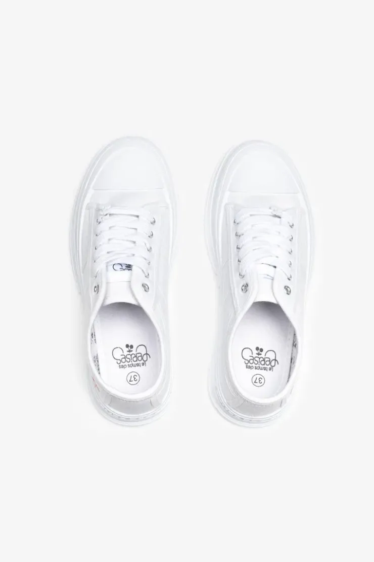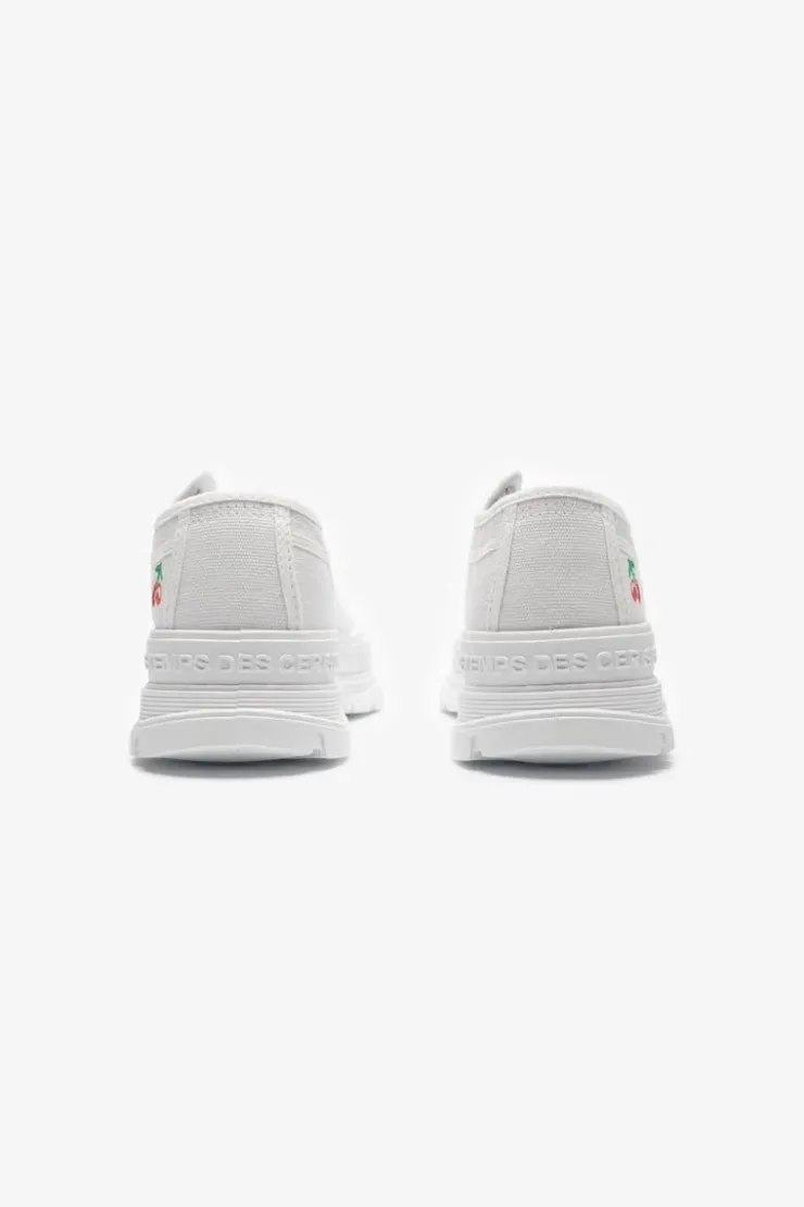 Ces Baskets En Toile Blanches Avec Leur Semelle Epaisse Blanche Sont L’Accessoire Ideal Pour Look Branche. Pour Le Detail, Des Cerises Rouges Sur Le Cote.