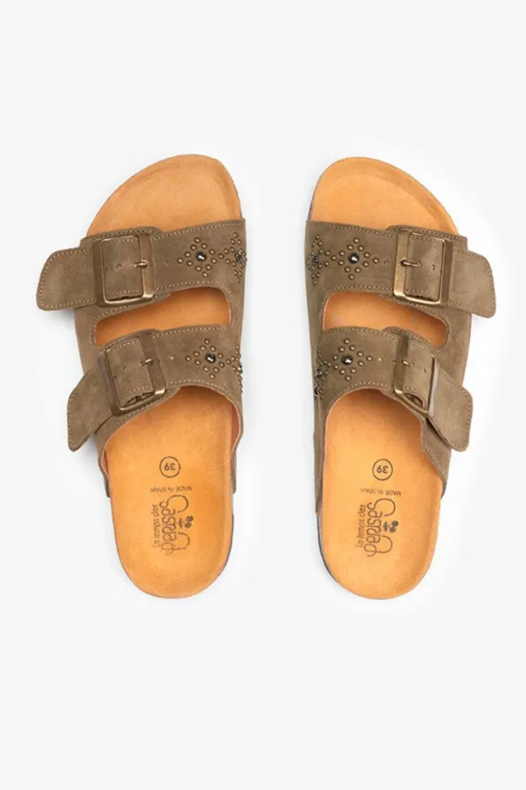 Ces Mules Naomie Kaki Sont Les Sandales Tendance De Votre Ete ! Avec Leur Matiere A L’Effet Daim, Leurs Boucles Metalliques Et Leurs Motifs Fantaisies Cloutes, Elles Completeront Vos Tenues Estivales A La Perfection.