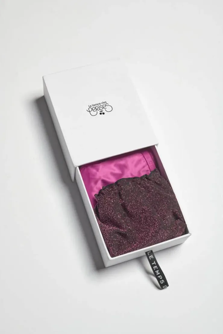 Ce Lot Feminin Et Raffine De Deux Culottes Est Compose D’Une Premiere Culotte En Satin Stretch Et Dentelle Fine Fuchsia Habillee D’Une Elastique Personnalise Le Temps Des Cerises, Et D’Une Seconde Culotte En Maille Douce Et Scintillante Noire Et Fuchsia Habillee D’Une Bordure A Volants Elastiquees. Ces Dessous Sont Romantiques Et Sont Enveloppes Par Une Jolie Boite Personnalisee Ltc.