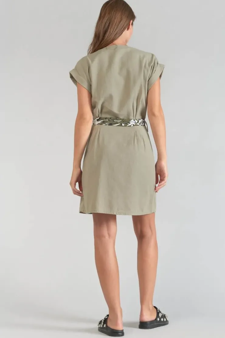 Cette Robe Eourres En Tissu Leger Kaki Clair Est Votre Allie Pour L’Ete. Sa Ceinture A Motif Kaki, Blanc Et Noir, Sa Boutonniere Argentee, Son Col Original Ainsi Que Ses Pinces A L’Avant Et A L’Arriere Pour Cintrer La Taille Apportent Le Cote Feminin A La Piece.