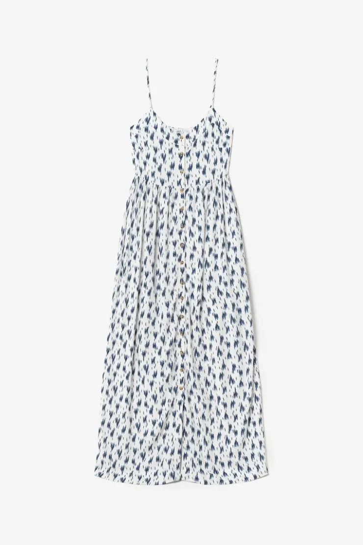 Cette Robe Evita Est Ideale Pour La Saison Estivale Avec Son Motif Effet Tie And Dye Bleu Sur Fond Blanc, Ses Fines Bretelles Et Ses Boutons En Guise De Fermeture Sur Toute La Longueur. Pour Plus De Confort, Les Bretelles Sont Reglables, La Robe Est Doublee Et La Partie Smockee Au Dos Permet De Resserrer La Poitrine.