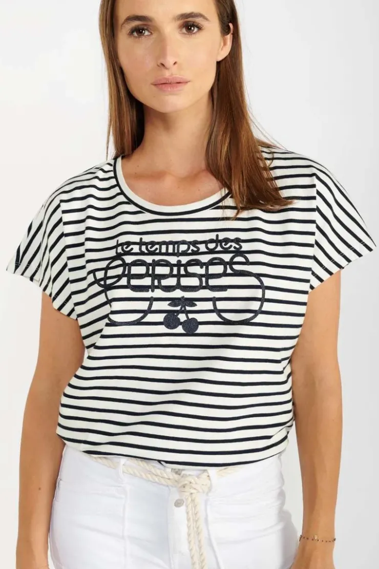 Ce T-Shirt Sailor Est Tendance Et Feminin Avec Sa Mariniere Et Son Imprime A Paillettes Bleu Marine Personnalise « Le Temps Des Cerises ». Sa Coupe Loose Apporte Encore Plus De Style A La Piece.