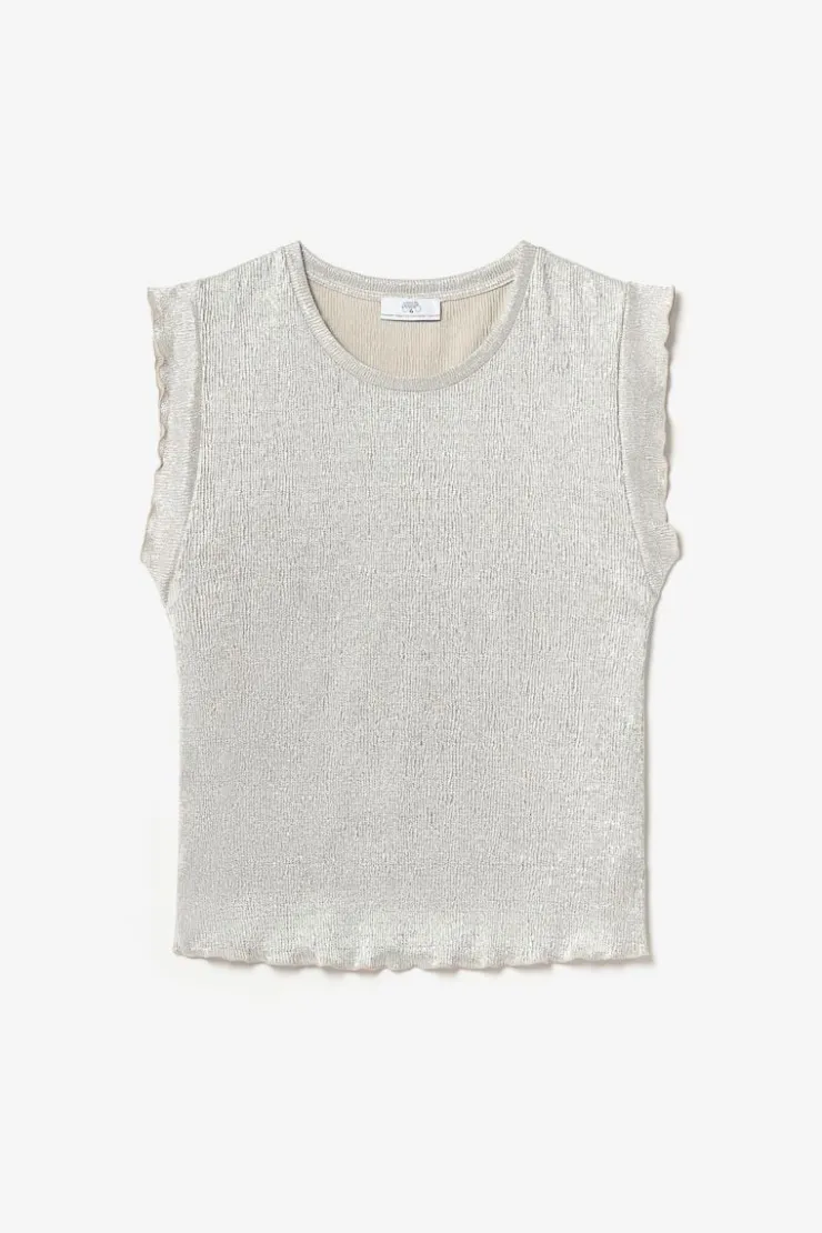 Ce Top Tamajon Sans Manches Argente, Au Style Chic Et Feminin, A Un Tissu Jersey Legerement Plisse Et Des Manches A Volants Tres Echancrees Pour Un Cote Raffine.