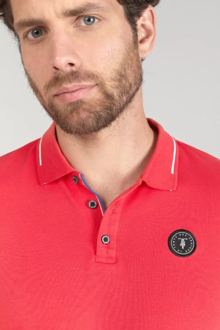 Ce Polo Aron Corail Au Toucher Doux Agreable Allie Elegance Et Tendance Avec Ses Details Comme Son Col Avec Lisere Blanc Et Son Ouverture Avec Lisere Colore Et Boutons Personnalises « Le Temps Des Cerises ». Pour Le Detail, Un Ecusson Personnalise « Le Temps Des Cerises » Sur La Poitrine Et Un Mini Lisere Drapeau Bleu, Blanc, Rouge Au Dos Au Niveau Du Col.