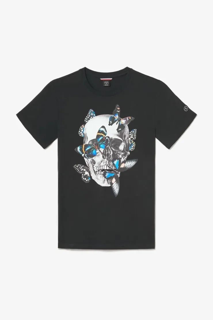 Ce T-Shirt Usma Noir A Un Look Rock Avec Son Imprime Tete De Mort Accompagne De Papillons Colores. Pour Le Detail, Un Ecusson Le Temps Des Cerises Sur La Manche Gauche.